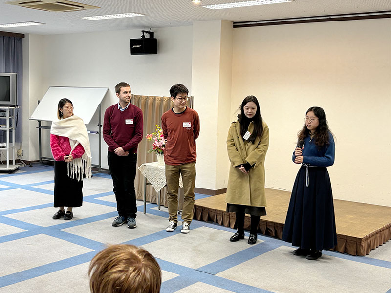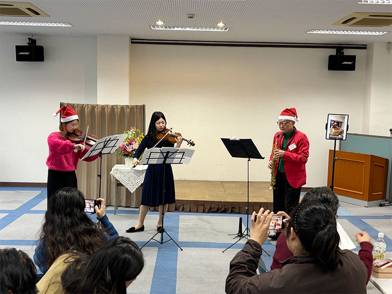 そのあとは留学生の皆さんによる歌や楽器の演奏が紹介され、さらにはカラオケタイムで佐伯嘉彦さん、坂本純一郎さんがのどを披露し、森永傅さん他の有志で一高寮歌「新墾の」を歌い、そのあとは、全員合唱で「ジングルベル」、「きよしこの夜」を歌って締めくくりました。小川の閉会挨拶のあと、記念写真撮影をしてお開きとなりました。