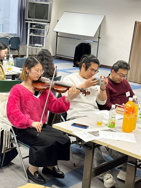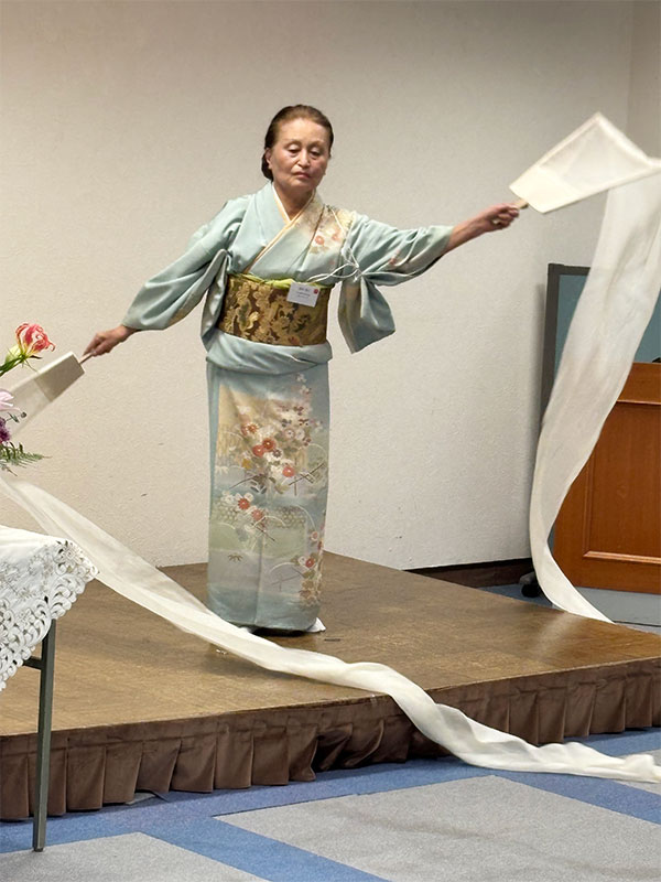 用意されたお弁当を食べ、そのあとしばし歓談ののち余興が開始されました。岡本岳さん、草留夕雅さん、そして中国留学生の羅 懐希さんによる器楽演奏、渋谷融子さんによる謡「屋島」、黒田瑞江さんによる日本舞踊「近江のお兼」などが披露されました。